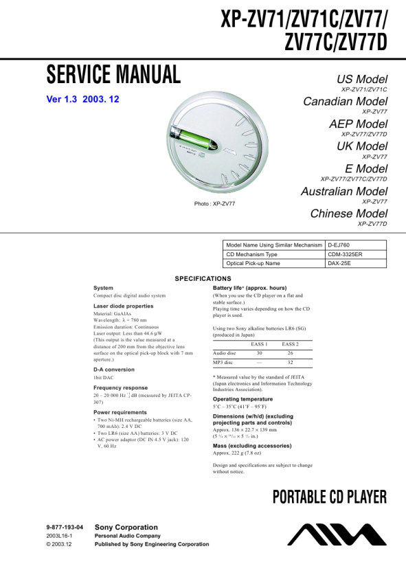 XP-ZV71/ZV71C/ZV77/ZV77D SECTION 1 SERVICING NOTE