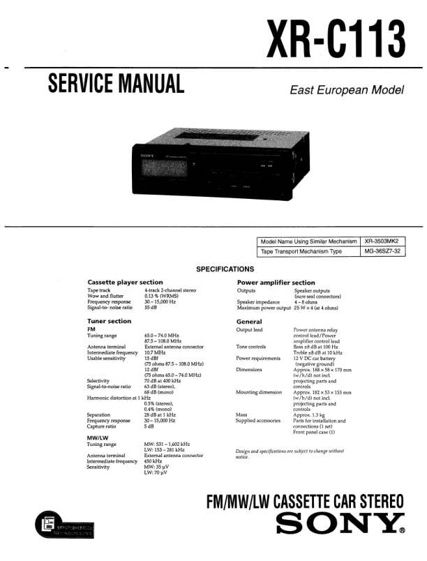Opis SONY XRC113 Instrukcja Serwisowa